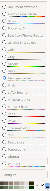 Jos paletissa on paljon värejä, on se vieritettävissä joko pysty- tai sivusuunnassa, riippuen Inkscapen versiosta tai asetuksista. Paletin oikean reunan napista voi valita tarjolla olevista paleteista haluamansa värivalikoiman.