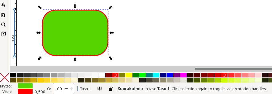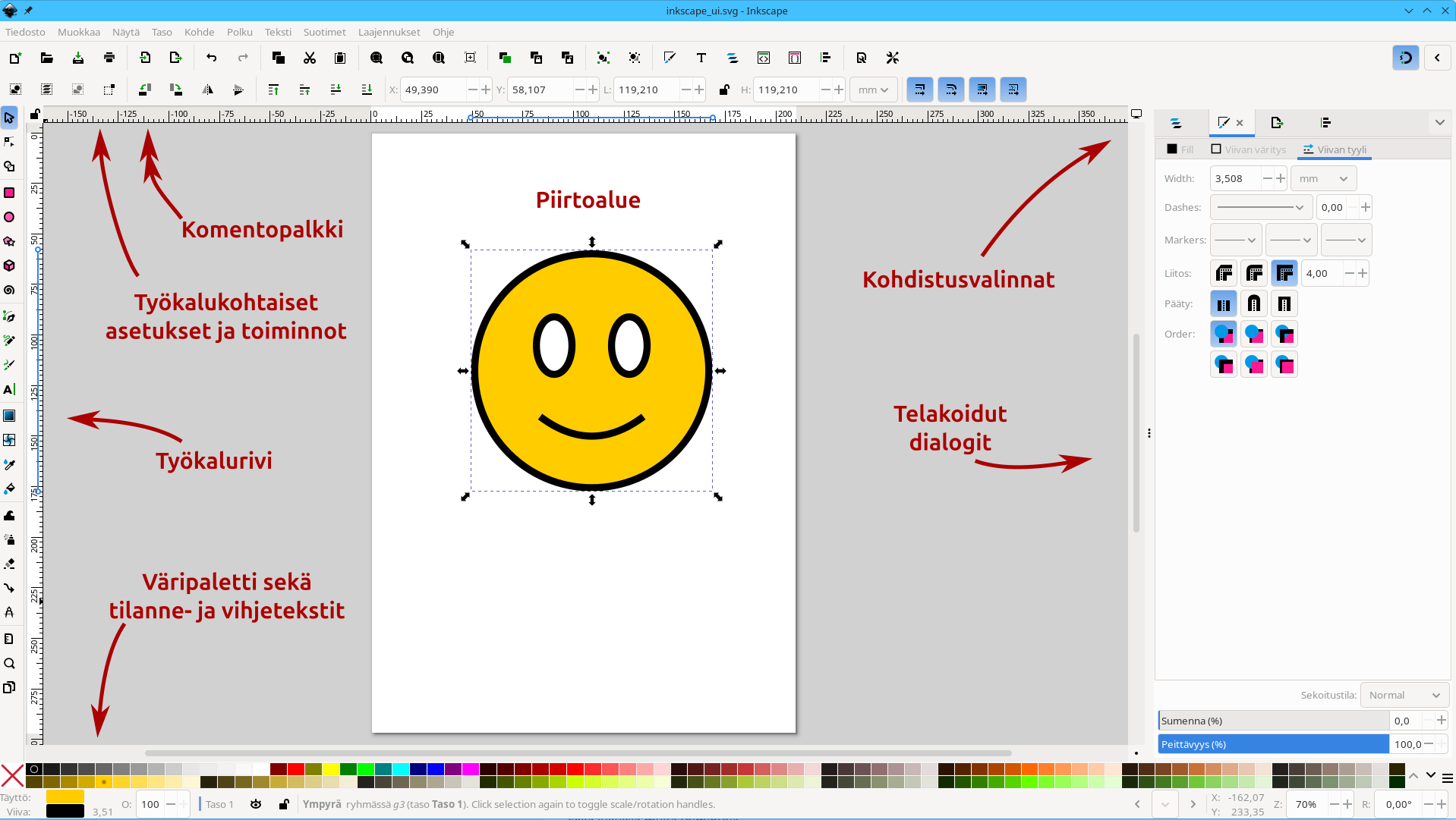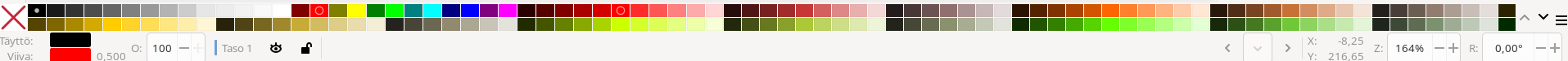 Paletin alapuolella on tilarivi, jossa ovat nähtävillä parhaillaan valitun kohteen täyttö- ja reunaväri, kohteen peittävyys prosentteina, pikavalintoja tasoasetuksille sekä tila- ja vihjeteksti.