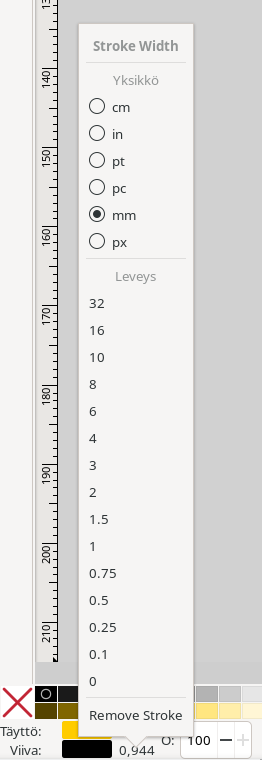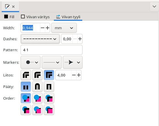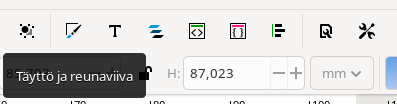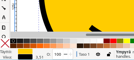 Kuvion täyttö- ja reunavärien nykyiset arvot näkyvät ikkunan vasemmassa alakulmassa. Jos kuviolla on reunaväri, näkyy sen oikealla puolella myös reunan paksuus lukuarvona.