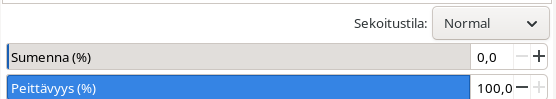Peittävyys on puolestaan oletuksena 100 % ja tarkoittaa, että kuviosta ei näy läpi. Mitä pienemmäksi tämän arvon muuttaa, sitä enemmän kuvion läpi näkyy sen alla olevia muita kuvioita tai taustaa. Arvo 0 tarkoittaa, että kuvio on täysin läpinäkyvä, eli näkymätön.