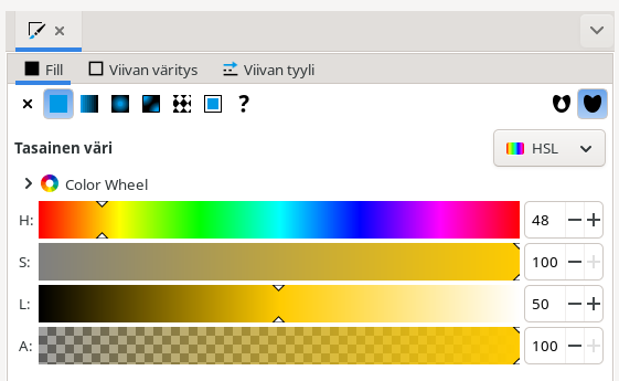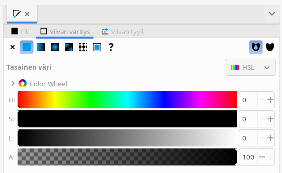 Näistä “ei väriä” sekä “tasainen väri” ovat suoraviivaisimmat. Muihin palataan myöhemmin. Tasaisen värin voi valita erilaisilla värienvalintatyökaluilla, joista HSL-muoto on ehkä selkein. Lyhenne tulee sanoista: