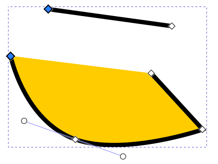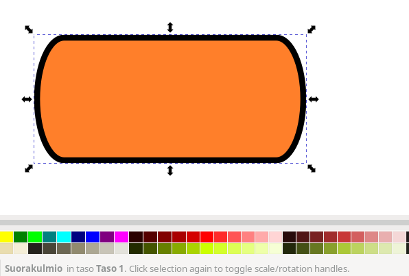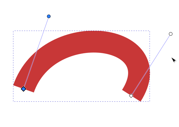 Jos taas suoraan viivaan halutaan lisätä päihin venytyskahvat, se voidaan tehdä valitsemalla viivan päätysolmut ja painamalla kaarevan viivan nappia. Saman voi toki tehdä jo edellä mainituilla tavoilla, eli Shift-vetämällä solmusta tai vetämällä itse viivasta.