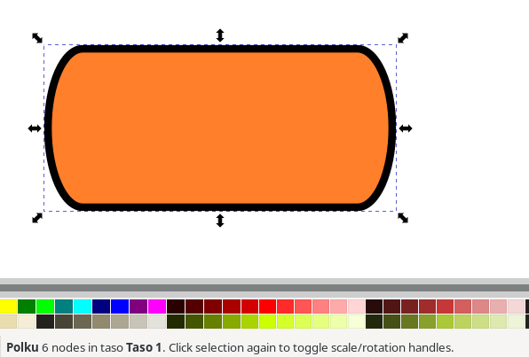 Näistä ensimmäinen muuntaa muuta tyyppiä olevat objektit poluiksi. Kun valintatyökalu on käytössä, alareunan vihjepalkissa näkyy tekstinä valitun piirto-objektin tyyppi. Alla olevassa ensimmäisessä kuvassa näkyy, että valittuna on suorakulmio, jonka kulmat on pyöristetty. Toisessa kuvassa käyttöön on valittu solmutyökalu, jolloin suorakaiteen ominaisuuksien kahvat ovat tulleet näkyviin. Solmutyökalulla voi muokata myös suorakaiteita. Kolmannessa kuvassa on painettu asetuspalkin “muuta poluksi” -painiketta ja suorakaide on muttunut vastaavan muotoiseksi poluksi, jossa on kuusi solmua. Neljännessä kuvassa on vielä otettu valintatyökalu käyttöön, jolloin vihjepalkki vahvistaa, että kyseessä on nyt polku.