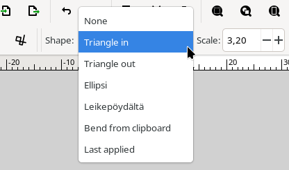 Asetuspalkin Shape-valinnalla voi valita muodon, jota piirrettävälle viivalle käytetään. Scale-lukuarvo määrää käytettävänmuodon kokoskaalan.